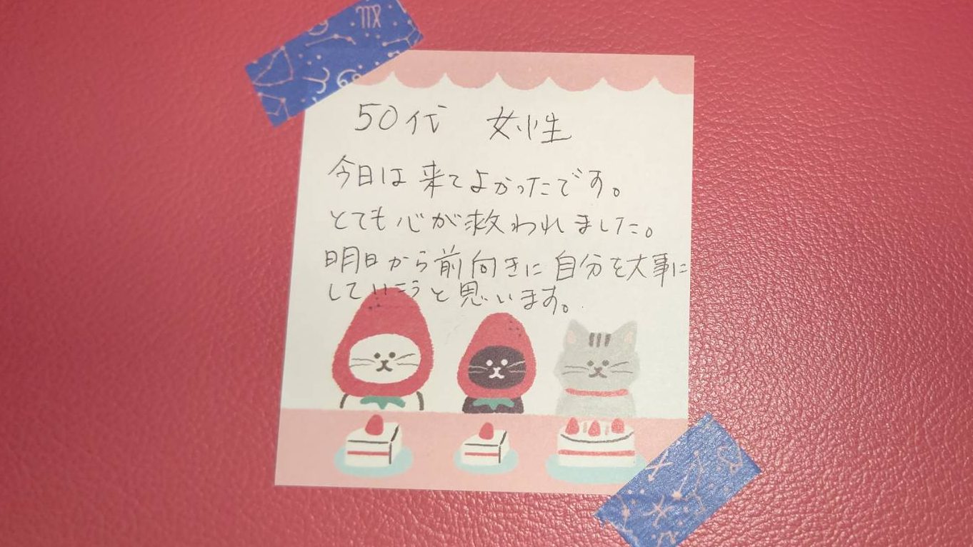 今日は来てよかったです。とても心が救われました。明日から前向きに自分を大事にしていこうと思います。