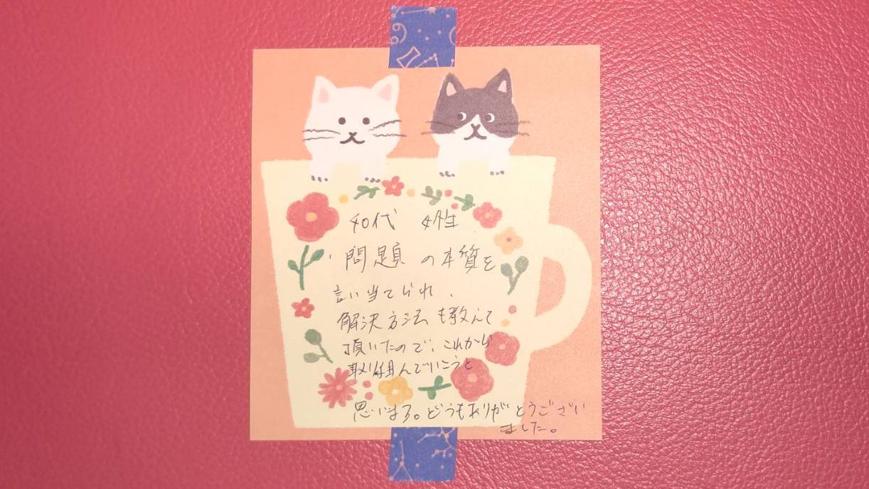 問題の本質を言い当てられ、解決方法も教えて頂いたので、これから取り組んでいこうと思います。 どうもありがとうございました。