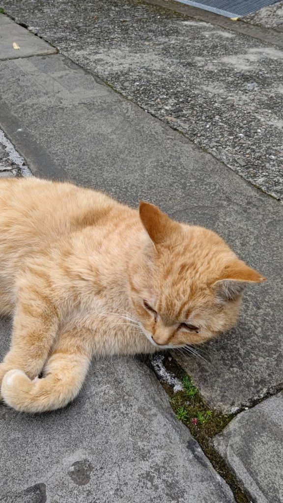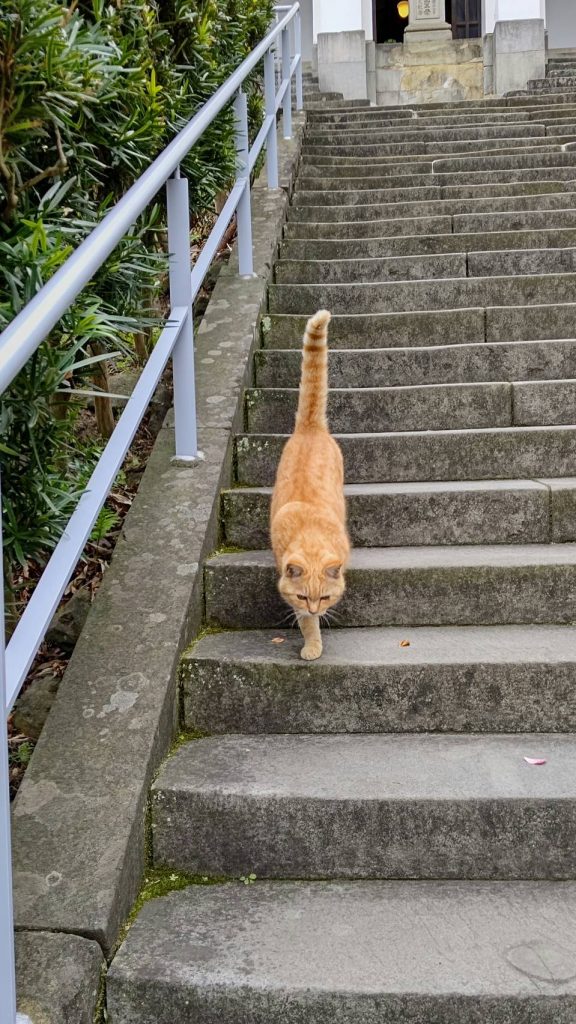 階段をうろうろしてる大浦天主堂の守り猫?修学旅行生にも触らせました。ふくよかな猫さんでしたよ。